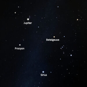 It lies above the Winter Triangle of stars, Sirius, Procyon and Betelgeuse in Orion.