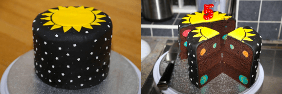 A perfect space cake. There are many ideas for some funky space cakes on the Internet. Some of them have a clearly visible universe or the solar system on the outside. You can also find a Galaxy Cake Pops arrangements designs. Matt did his cake with a twist. It is not until the cake have been cut the mystery of the universe became revealed to the guests. To download the recipe, please visit our free resources page. Matt’s recipe also provides a suggestion on how to make his cake dairy-free for those who might suffer from allergies.